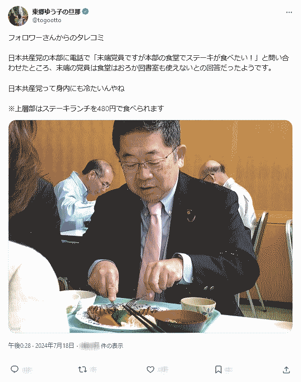 | … | 504無念Nameとしあき25/12/30(火)19:51:39No.1376693456そうだねx3>共産党本部食堂では下っ端から集めた金で本部職員だけが食べられる格安ステーキがあるんだったか |