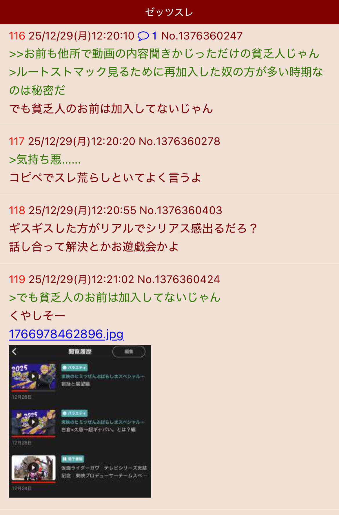 | … | 265無念Nameとしあき25/12/30(火)23:21:43No.1376748502+ゴミみたいな人達が番組叩きや特撮俳優の不祥事をネタにずっと馴れ合ってるのがふたばの特撮スレだよ |