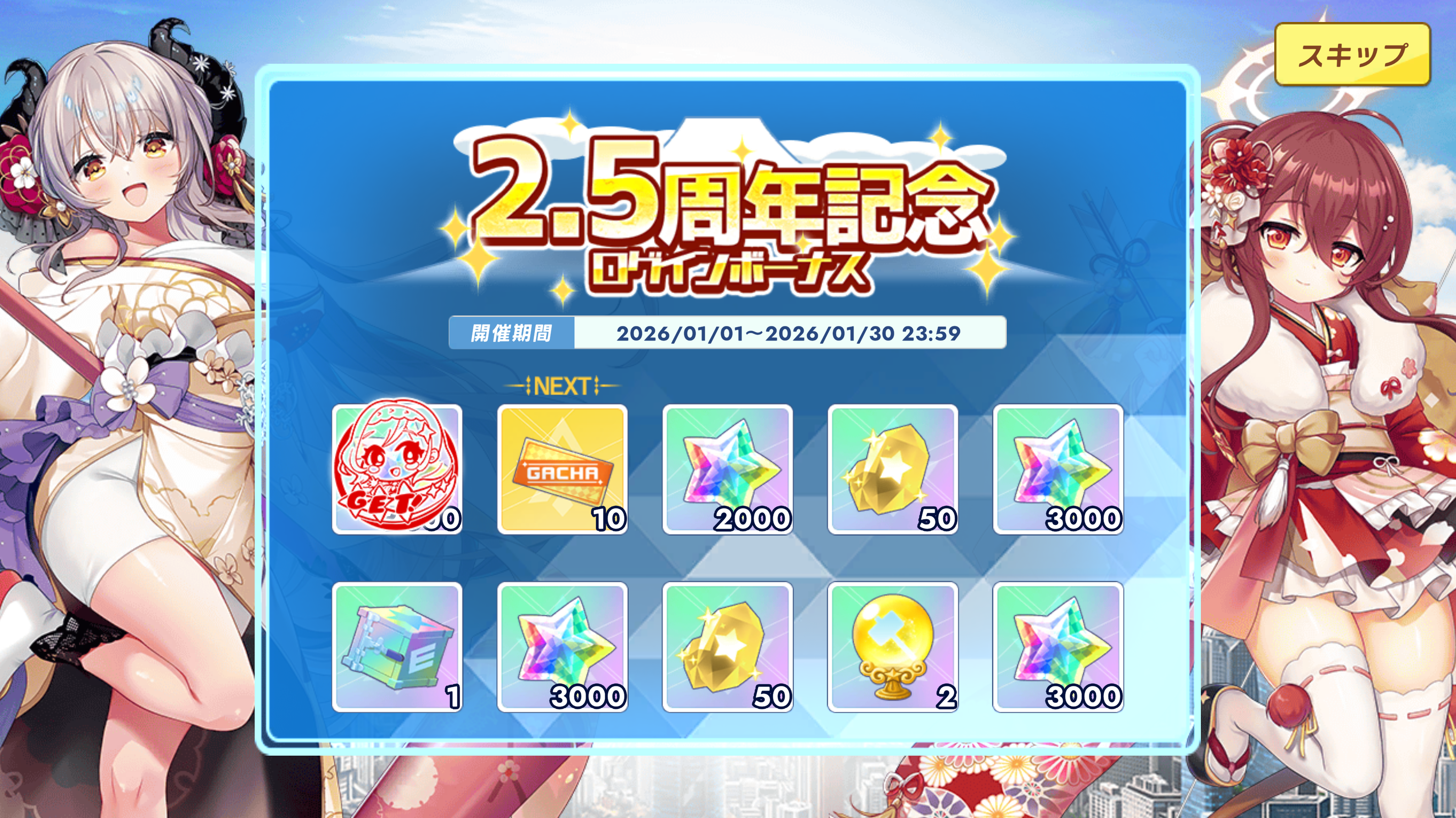 | … | 32無念Nameとしあき26/01/01(木)00:34:08No.1377042002そうだねx1ログボと箱ガチャで2万くらいもらえるから天井までに片方出たら限定無料配布ティン |