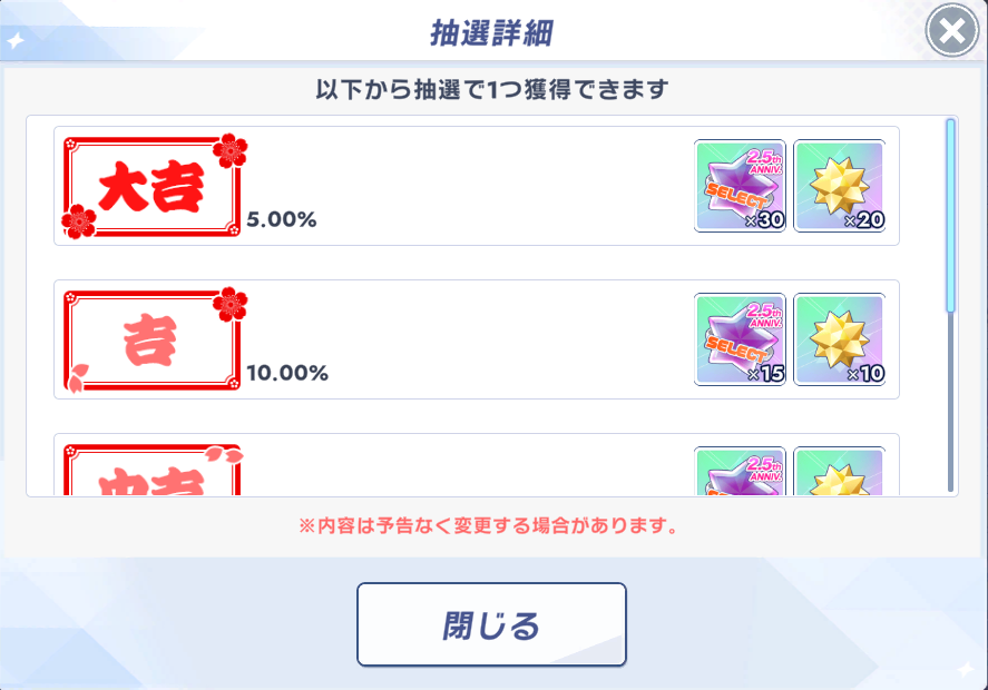 | … | 134無念Nameとしあき26/01/01(木)02:24:00No.1377060833そうだねx2今回のおみくじシステム即座に結果わかるし前回みたいに報酬差も生まれにくいしなにより確実に限定のピース手に入るのがイイね |