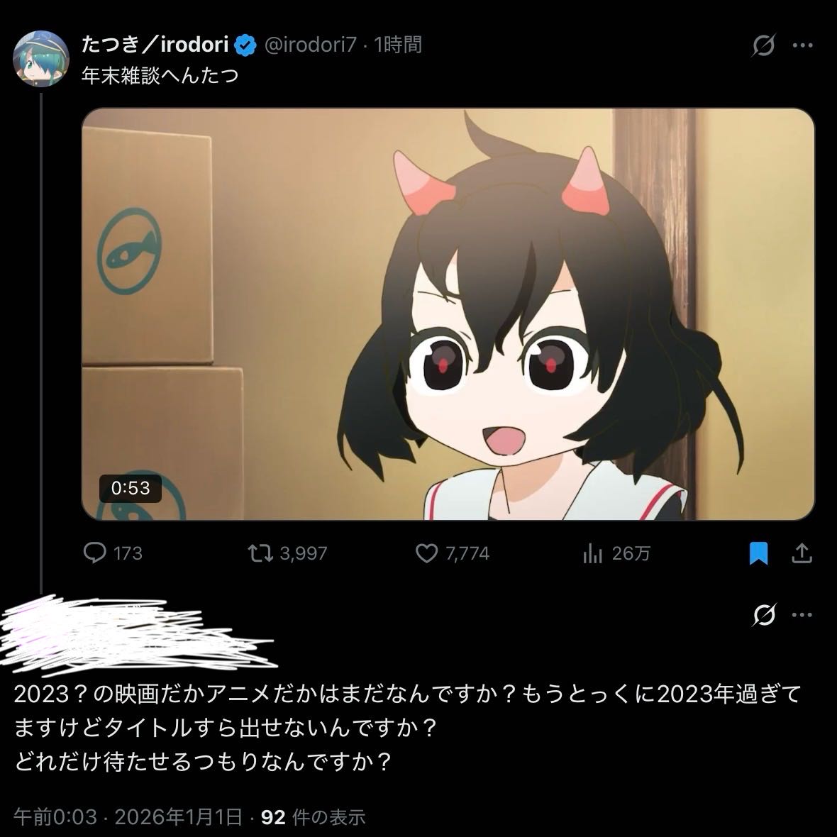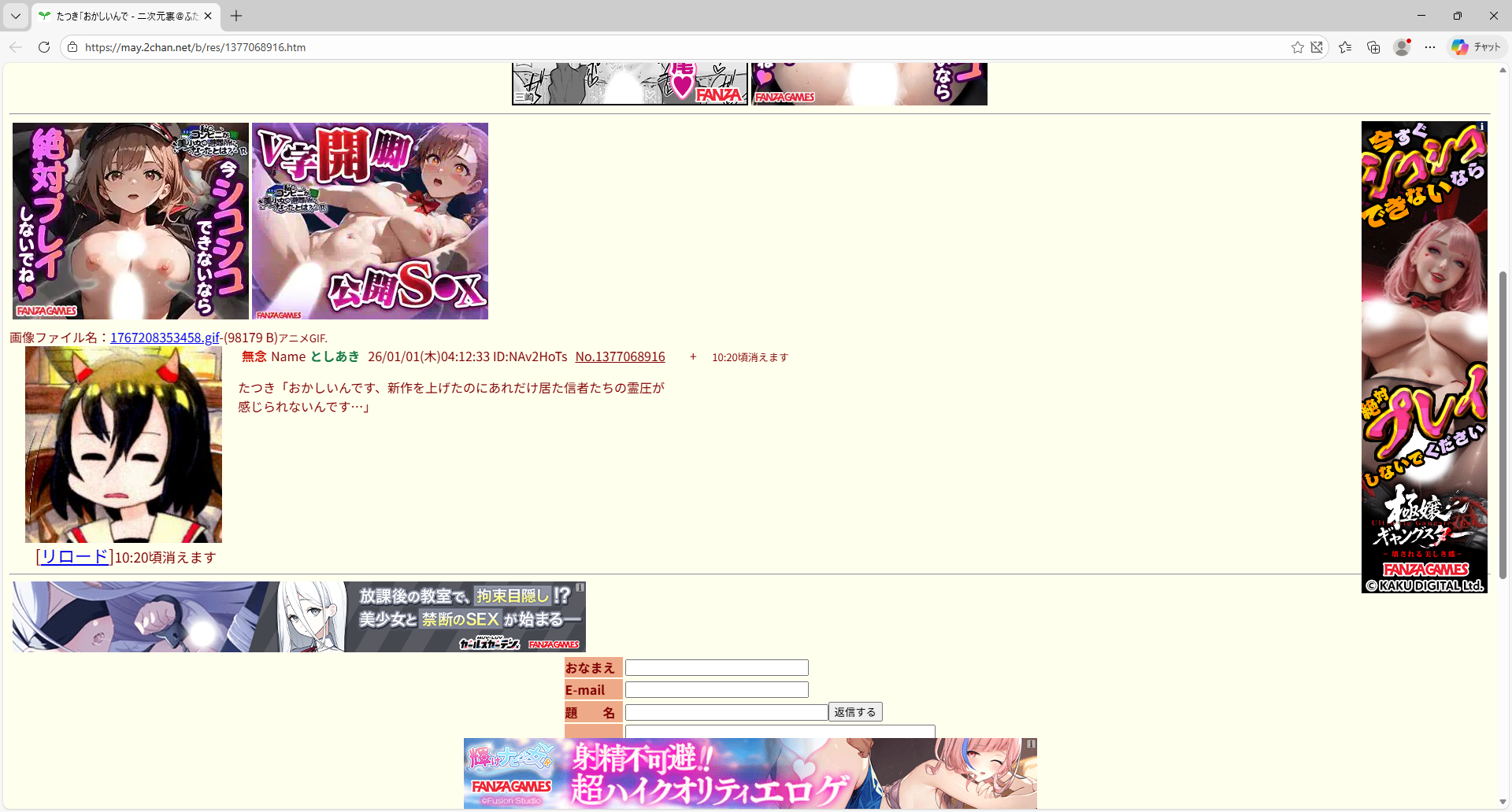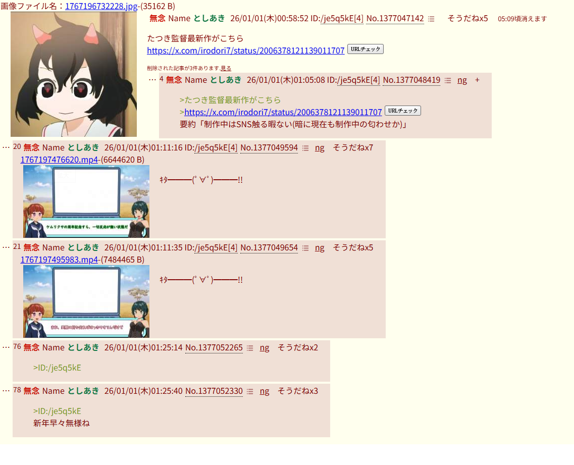 | … | 967無念Nameとしあき26/01/01(木)05:55:50No.1377072251+>もうたつきの新作はゼロよ |