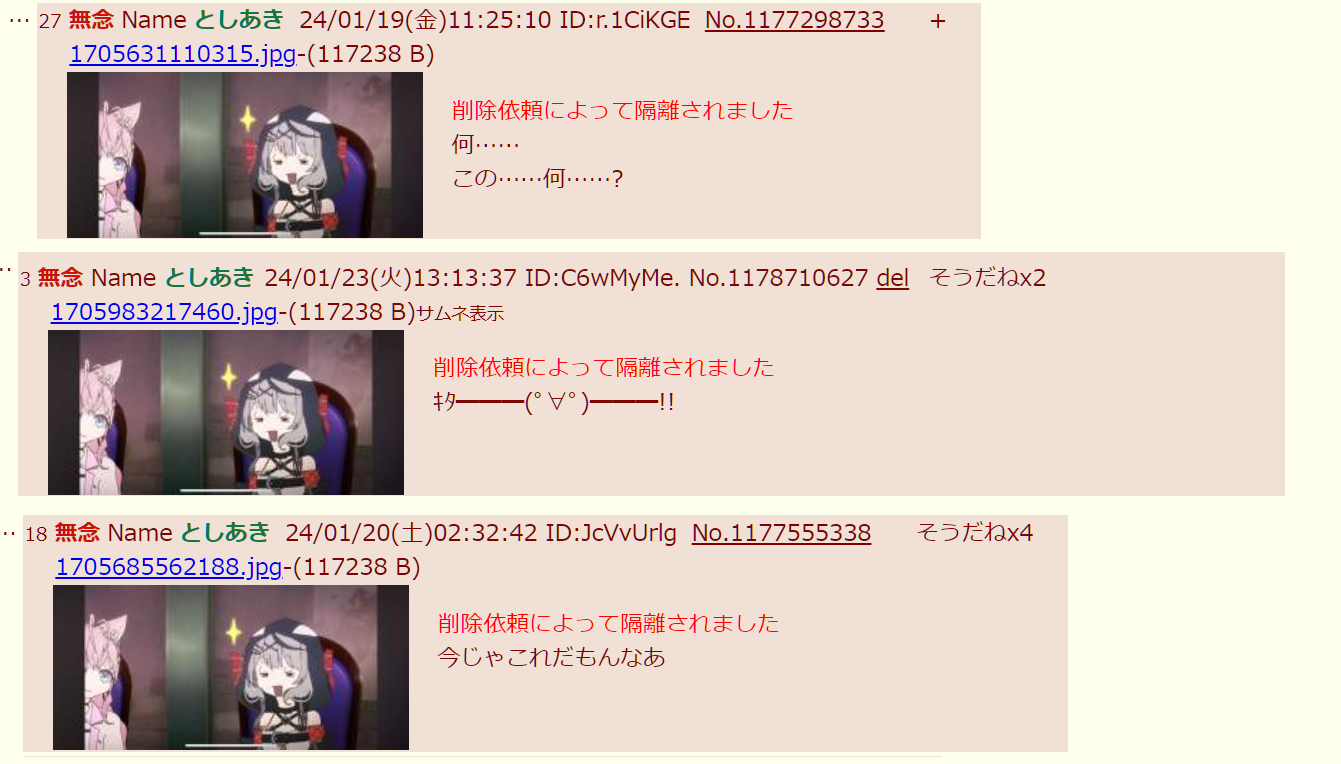 | … | 948無念Nameとしあき26/01/01(木)05:52:47No.1377072146そうだねx3顔真っ赤にした吉崎関係者が息抜きのアニメに発狂する風物詩なんやなw |