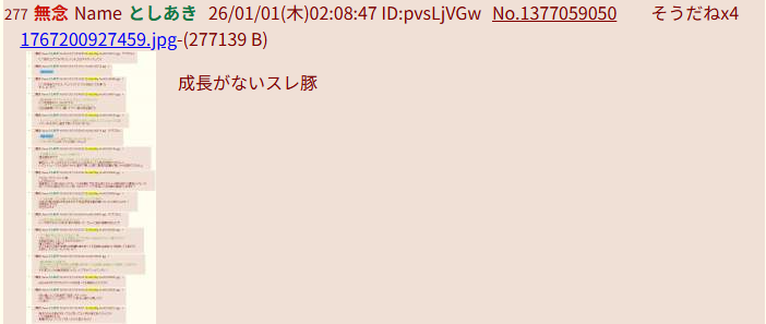 | … | 981無念Nameとしあき26/01/01(木)06:00:24No.1377072398そうだねx1>逆張りしたいだけのアホで移民してきてふたば荒らしてるアホだよコイツ |