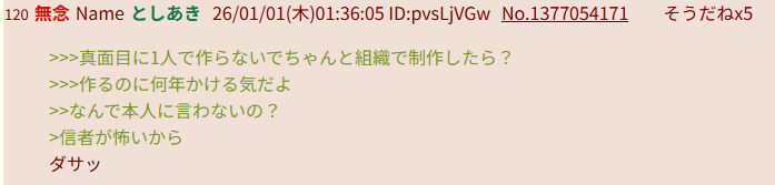 | … | 11無念Nameとしあき26/01/01(木)01:09:09No.1377049193+たつきって今は個人でやってるの?集団でやってるの? |