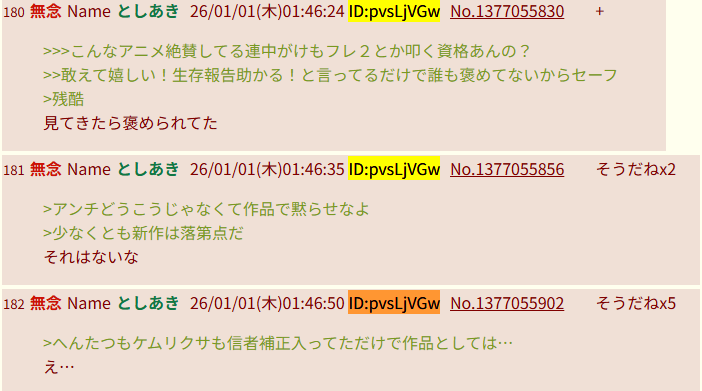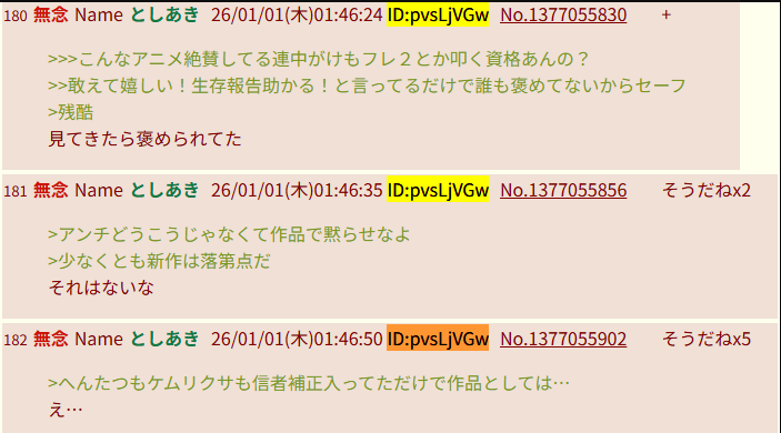 | … | 81無念Nameとしあき26/01/01(木)01:26:36No.1377052498+>誰かを叩いてもアニメの出来は良くならないんだ |