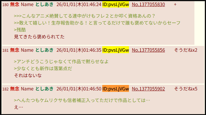 | … | 46無念Nameとしあき26/01/01(木)01:18:20No.1377050936そうだねx9>アンチ叩いてもたつき監督のアニメのクオリティは上がらないんだ |