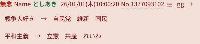 | … | 186無念Nameとしあき26/01/01(木)10:12:43No.1377095209そうだねx1>平和主義 → 立憲 共産 れいわ |