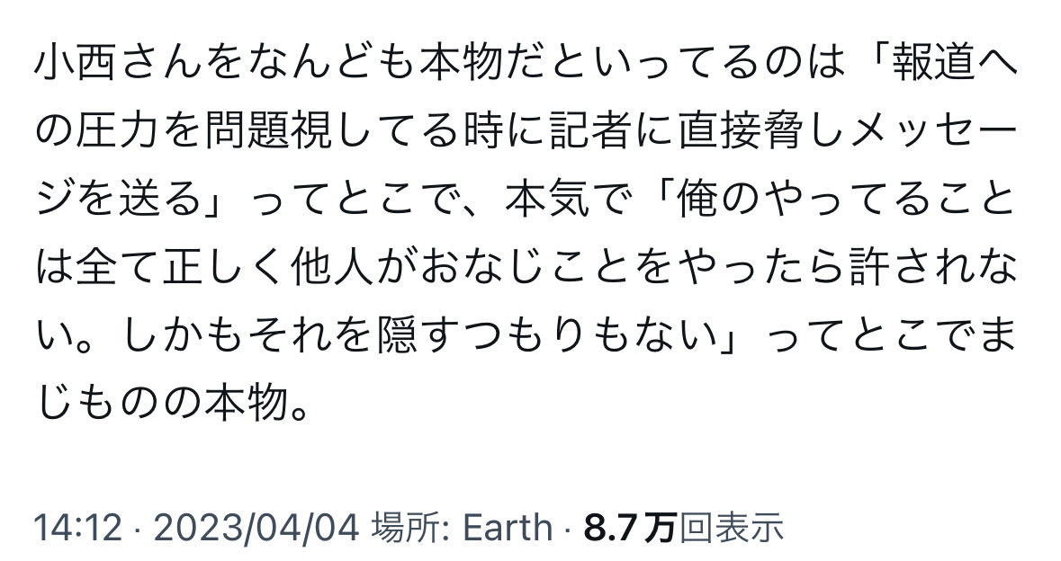 | … | 131無念Nameとしあき26/01/01(木)09:44:12No.1377090513+この前いきなりまともなこと言いだしたから何事かと思ったがやっぱりいつもの小西だったわ |