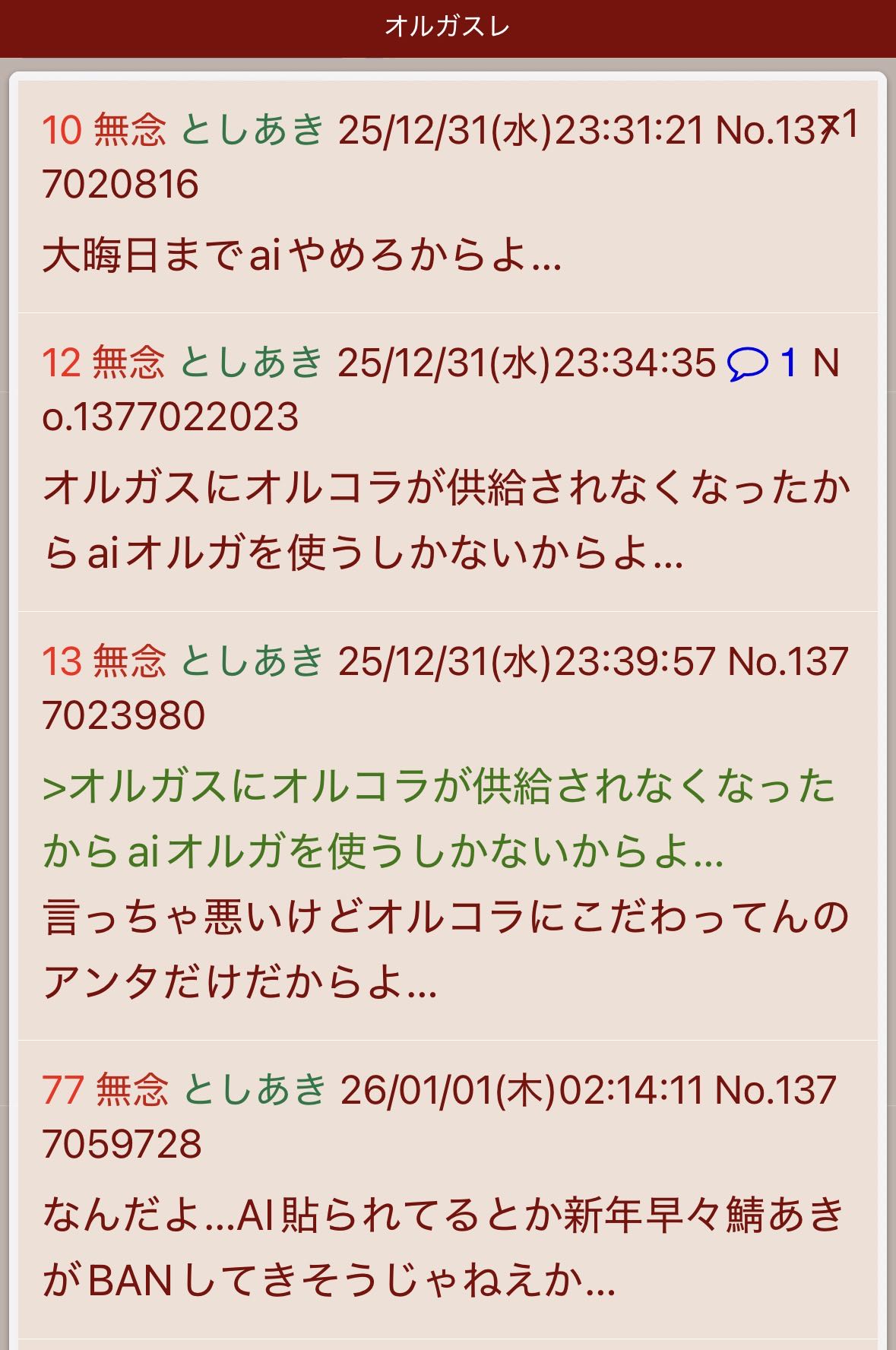 | … | 37無念Nameとしあき26/01/02(金)21:31:02No.1377473981+重複オルガス立ててんのいつものクソコテじゃねぇか… |