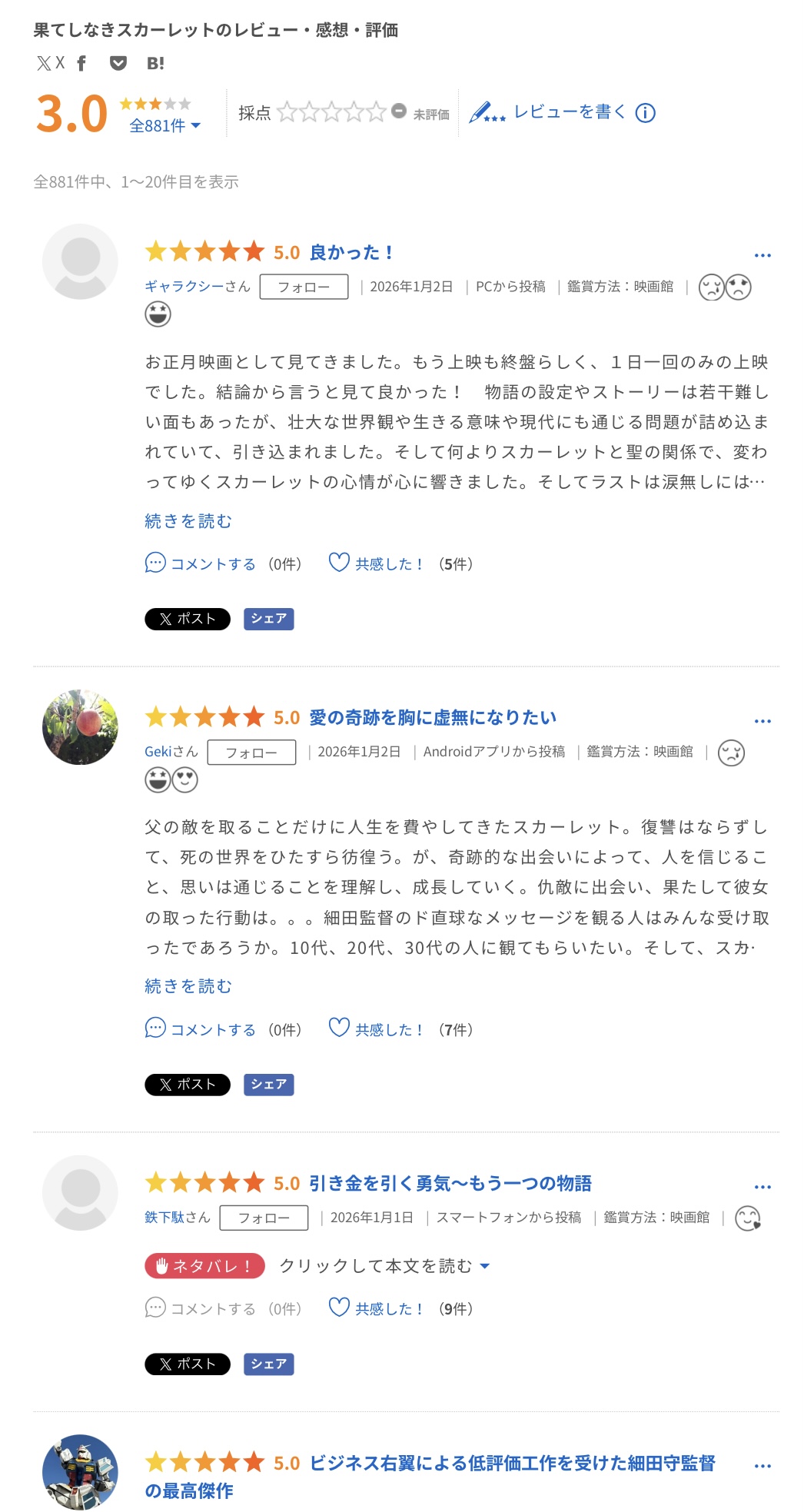 | … | 229無念Nameとしあき26/01/02(金)23:05:23No.1377500582+ 1767362723527.jpg-(357832 B) https://eiga.com/movie/103145/review/all-rating/ |