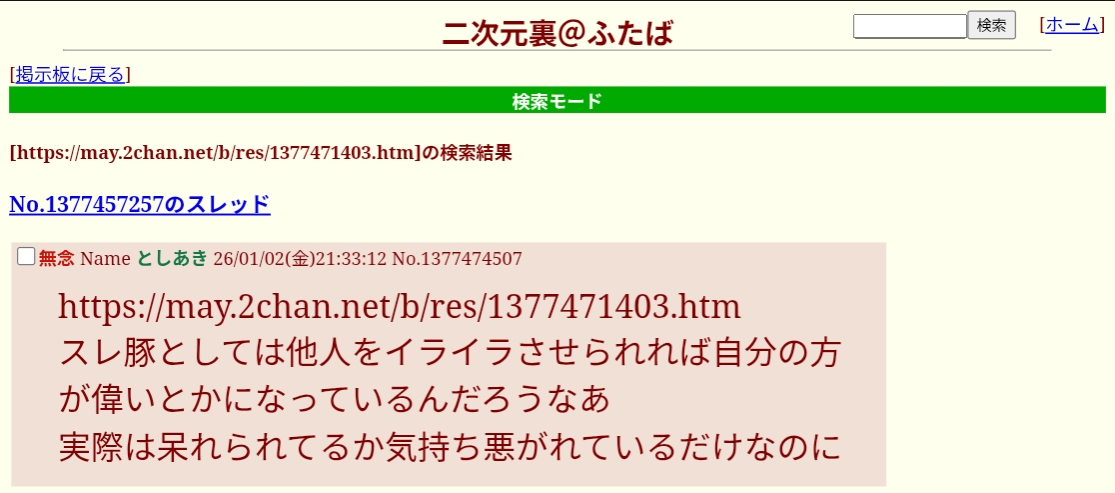 | … | 2無念Nameとしあき26/01/02(金)21:23:22No.1377471929+https://may.2chan.net/b/res/1377445406.htm |