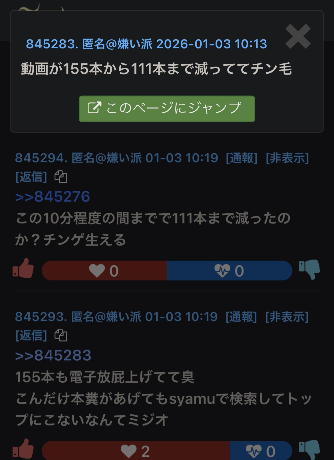 | … | 23無念Nameとしあき26/01/03(土)08:41:30No.1377555016+syamuさんだって人を誹謗中傷する時だけはびっくりするほどIQ上がるんだぞ |