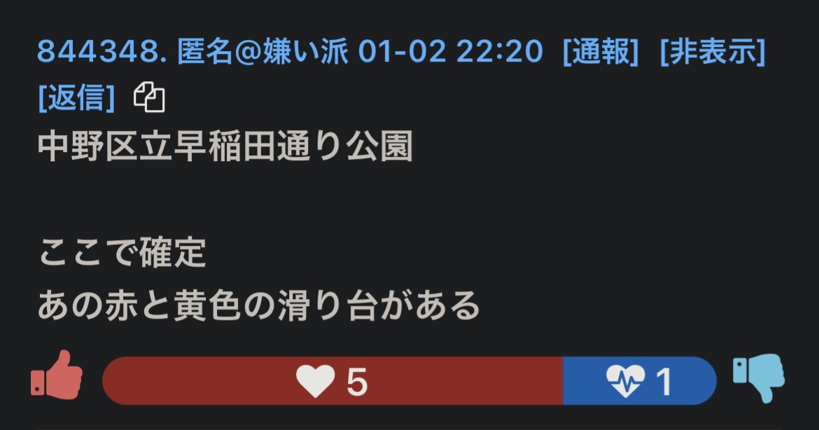 | … | 65無念Nameとしあき26/01/03(土)10:49:34No.1377575142+公園付近に潜伏先があると思われる |