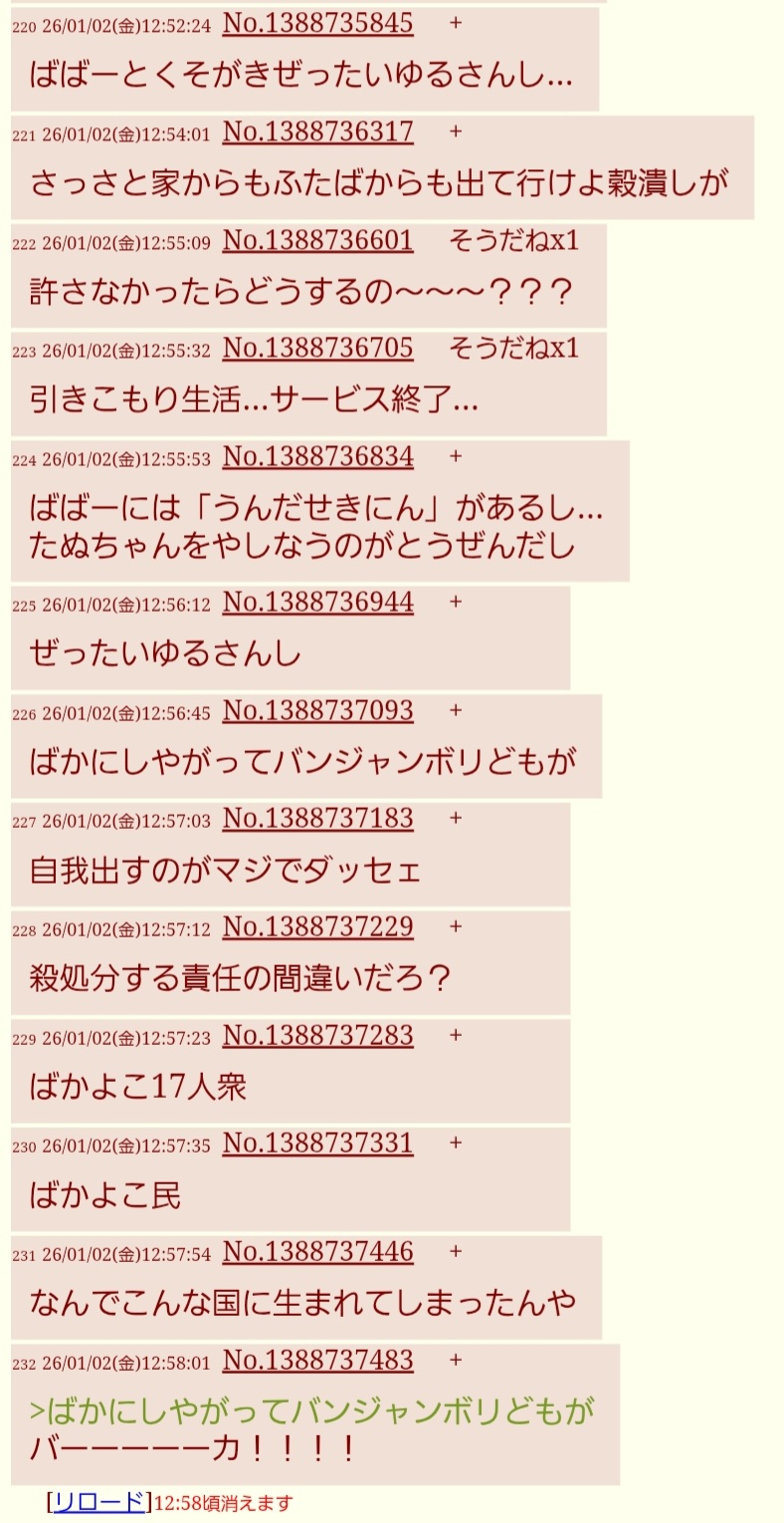 | … | 3無念Nameとしあき26/01/03(土)08:05:36No.1377550838そうだねx12>新年明けたらさっさと閉めましょうてめぇらの人生の幕も閉めましょう |