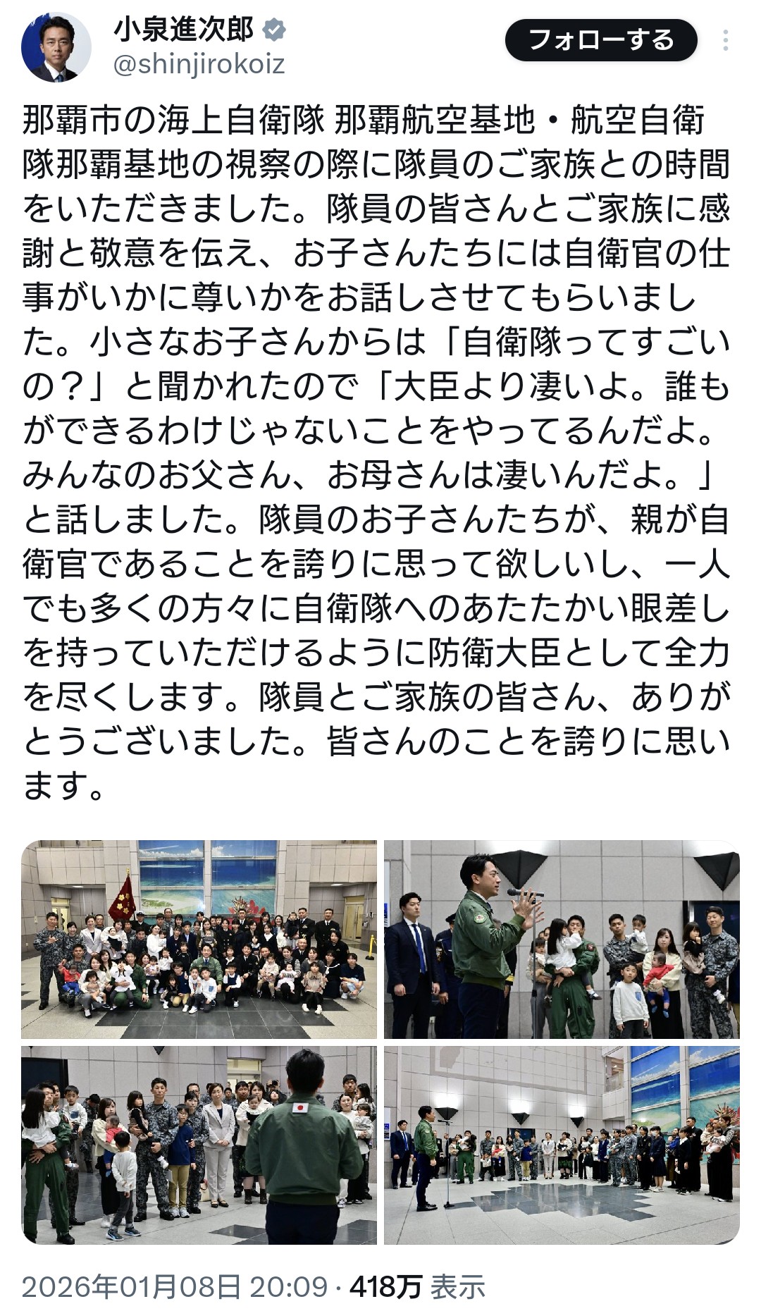 | … | 183無念Nameとしあき26/01/12(月)02:11:08No.1379564787そうだねx10 1768151468638.jpg-(145248 B) 進次郎は自衛隊員の家族にまで言及したのはよかったわ |