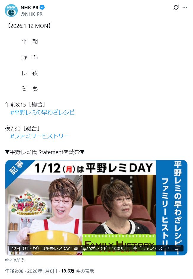 | … | 35無念Nameとしあき26/01/12(月)08:02:25No.1379580359そうだねx2生で見れなければNHKoneでレミを摂取せよ! |