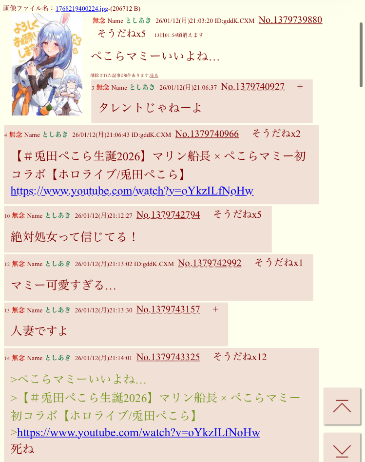 | … | 16無念Nameとしあき26/01/13(火)20:56:43No.1379945341そうだねx20 1768305403931.png-(245351 B) >ここはぺこらファン昔から多いだろ |