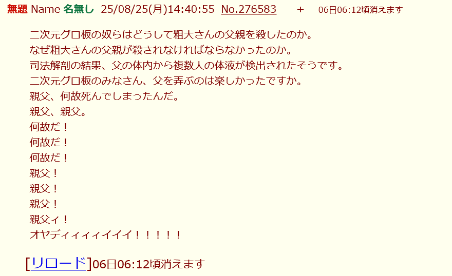 | … | 94無念Nameとしあき26/01/14(水)07:30:33No.1380022163そうだねx1スレ豚ってだめ弟子さんにも訴えたら自殺するぞって泣きついていたから自傷の可能性ありと見なされて拘束されたまま取り調べになる可能性が高いんだよね |