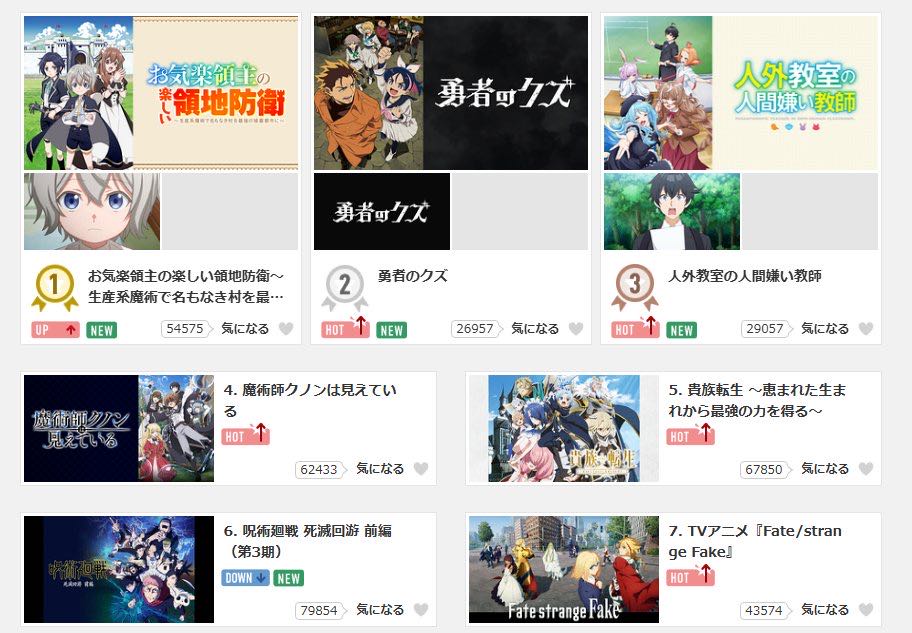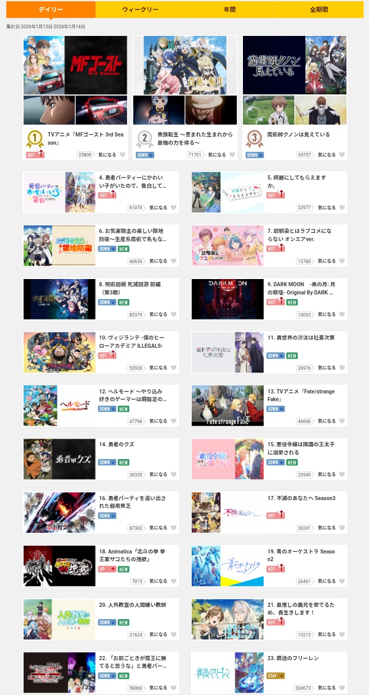 | … | 37無念Nameとしあき26/01/15(木)09:45:32No.1380241935そうだねx3>>ピークが最序盤なのが多いので1クールアニメとの相性が良い |
