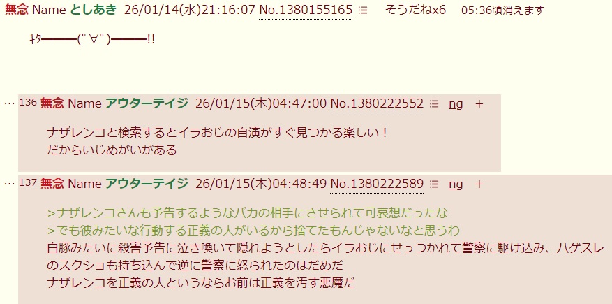| … | 69無念Nameとしあき26/01/15(木)11:03:28No.1380251207そうだねx5>自演失敗してスレ爆破も失敗して発狂して画像ペタペタが無様な負け姿でなく何なのか |