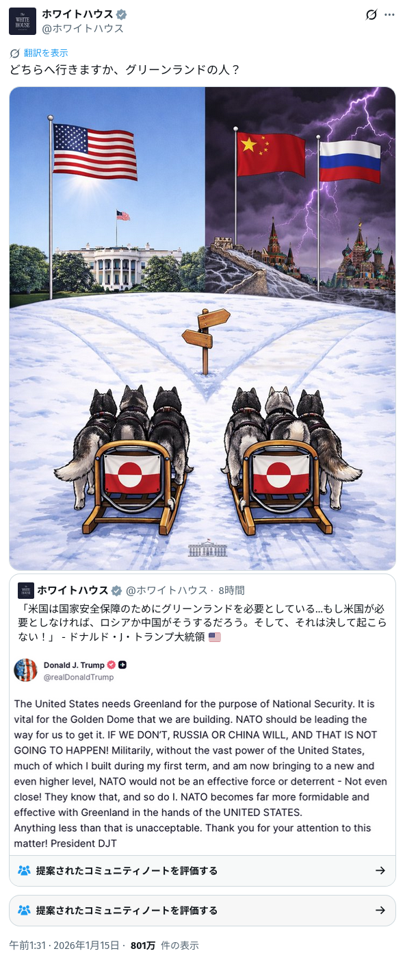 | … | 55無念Nameとしあき26/01/15(木)11:07:56No.1380251702+>>NATOが守るからアメリカの支配下に置く必要なくない? |