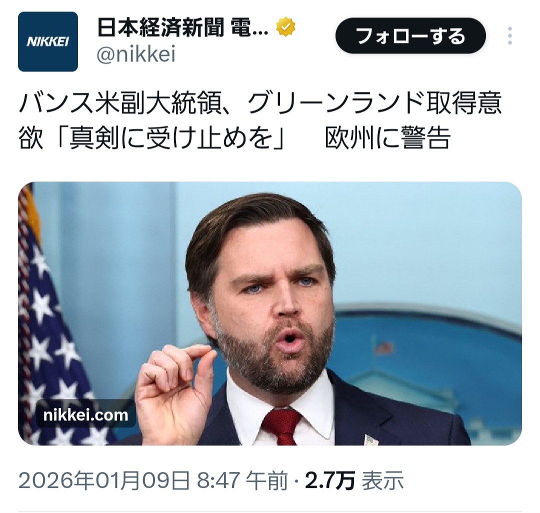 | … | 53無念Nameとしあき26/01/15(木)11:05:33No.1380251447+NATOとG7崩壊で日本はアメリカの子分として欧州と対立 |
