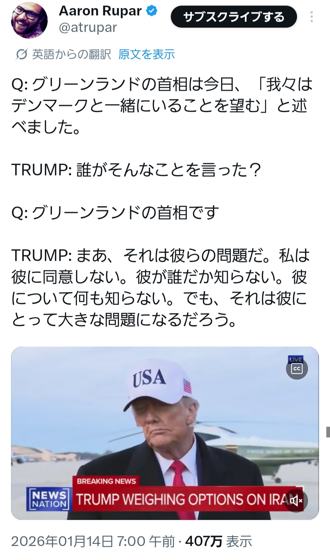 | … | 196無念Nameとしあき26/01/15(木)12:40:56No.1380266535+ 1768448456051.webp-(67374 B) 別に現地民の意思とかそういうのどうでもいいしトランプからすりゃ軍事攻撃予告してそれでも拒否してくるなら舐めてるって話でしょ |
