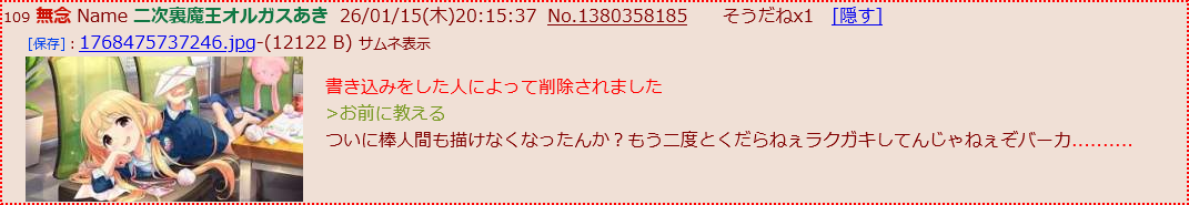 | … | 143無念Nameとしあき26/01/15(木)20:53:15No.1380369571+極めて知能が低い知恵遅れの荒らしが |