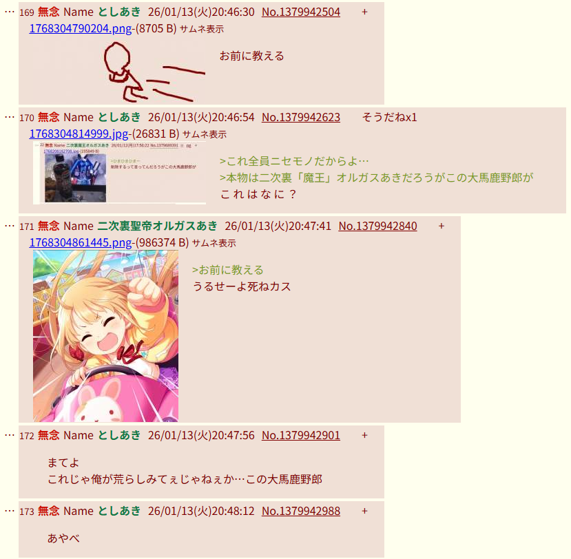 | … | 29無念Nameとしあき26/01/15(木)18:18:11No.1380327064+暇空スレで団長の画像レス貼ったら暇アノンにオルガスがcolab信者の巣認定されたからよ… |