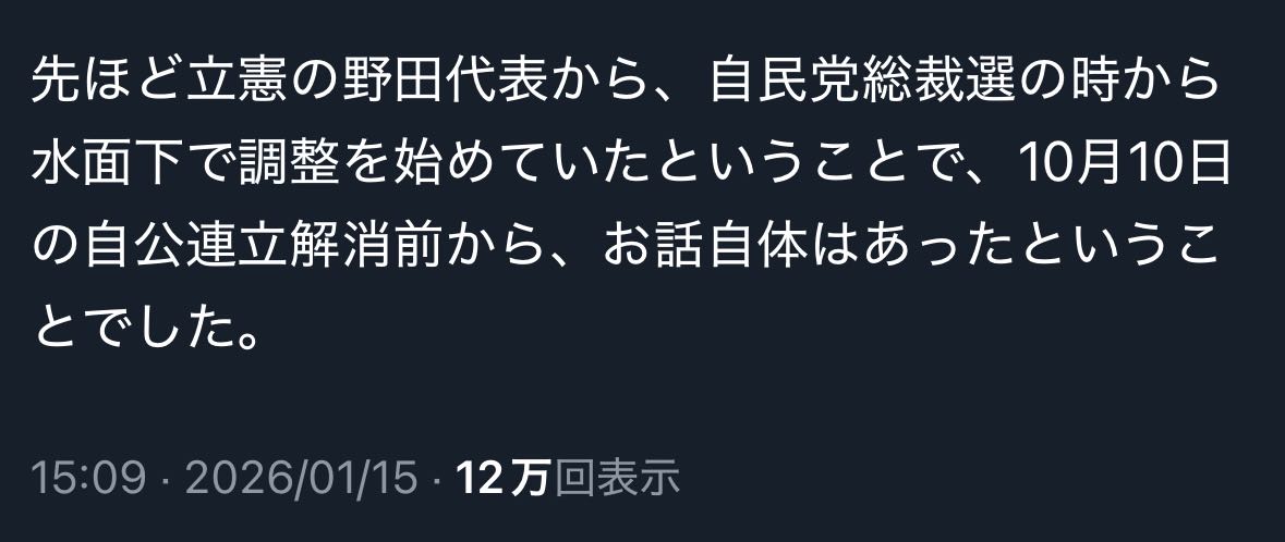 | … | 984無念Nameとしあき26/01/15(木)17:22:58No.1380315271+>正直立憲と公明の合流報道から |