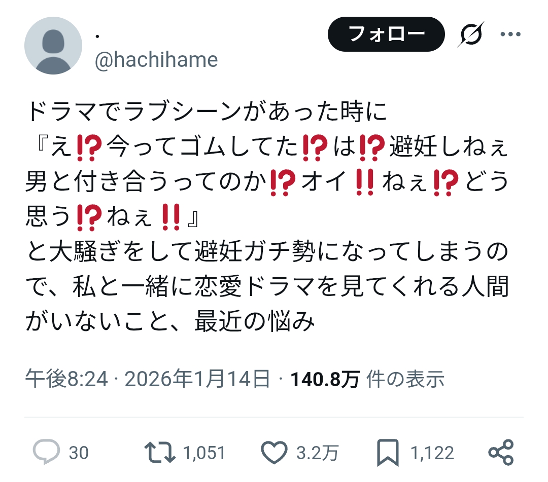 | … | 85無念Nameとしあき26/01/16(金)01:32:09No.1380434907+ラブシーンに避妊描写があるドラマの方が珍しいと思うんだが |