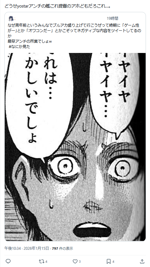 | … | 520無念Nameとしあき26/01/16(金)17:29:47No.1380538456そうだねx7 1768552187659.jpg-(18841 B) アズレン界隈は少しでも批判すると守護者がかっ飛んできて提督のレッテル貼られる監視社会わよ |