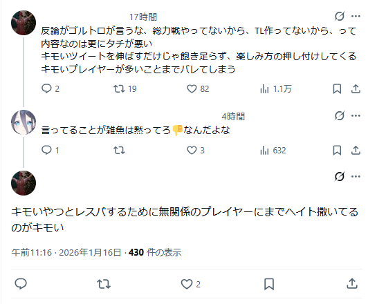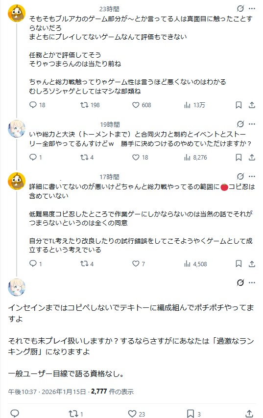 | … | 550無念Nameとしあき26/01/16(金)17:41:01No.1380540557そうだねx5元プレイヤーや現役もいるからこその批評なのにやたらとエアプ扱いしだす指揮官せんせぇ達 |