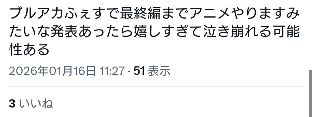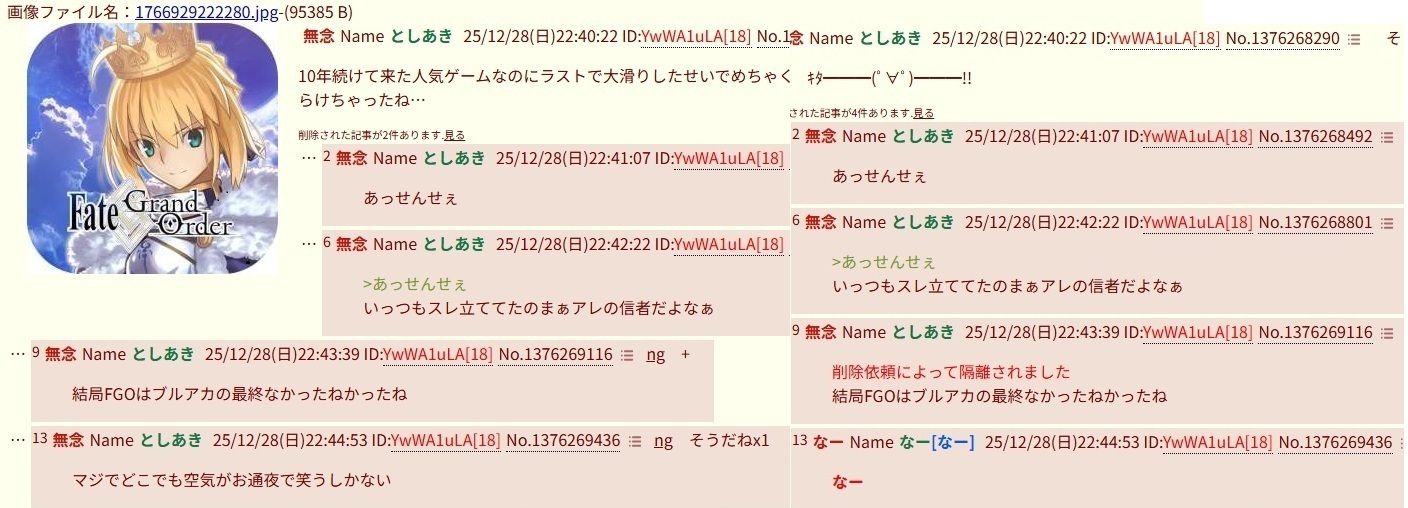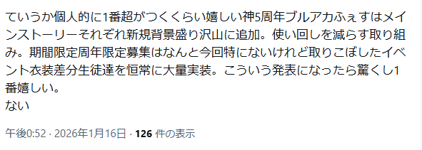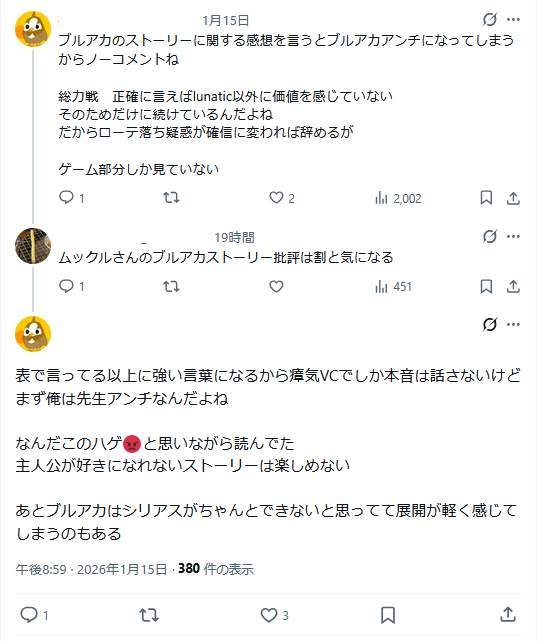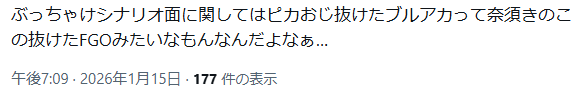 | … | 514無念Nameとしあき26/01/16(金)17:26:16No.1380537782+>デカグラ個人的には完結したらブルアカのストーリーもそのまま完結するほどの題材扱ってると思うから |