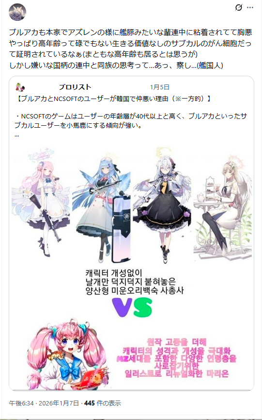 | … | 522無念Nameとしあき26/01/16(金)17:30:44No.1380538641そうだねx2 1768552244364.png-(687996 B) 控えめに見てもブルアカはアズレンよりは上なのに守護者気取りのせんせぇの思考はよく分からないわね |