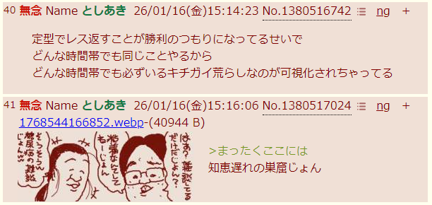 | … | 40無念Nameとしあき26/01/16(金)15:14:23No.1380516742そうだねx1定型でレス返すことが勝利のつもりになってるせいで |