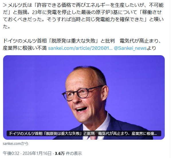 | … | 256無念Nameとしあき26/01/16(金)22:39:04No.1380619447そうだねx1>サウジですら石油転換に取り組んでいるのに |