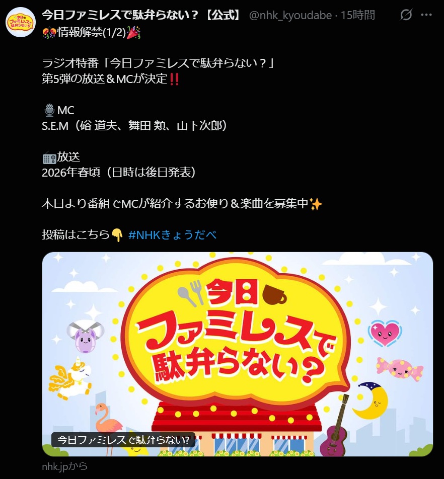 | … | 43無念Nameとしあき26/01/17(土)09:45:49 ID:S0Sc.NcsNo.1380693588+>1/23(金)23:59まで、番組で紹介するお便り&リクエスト楽曲を募集します |