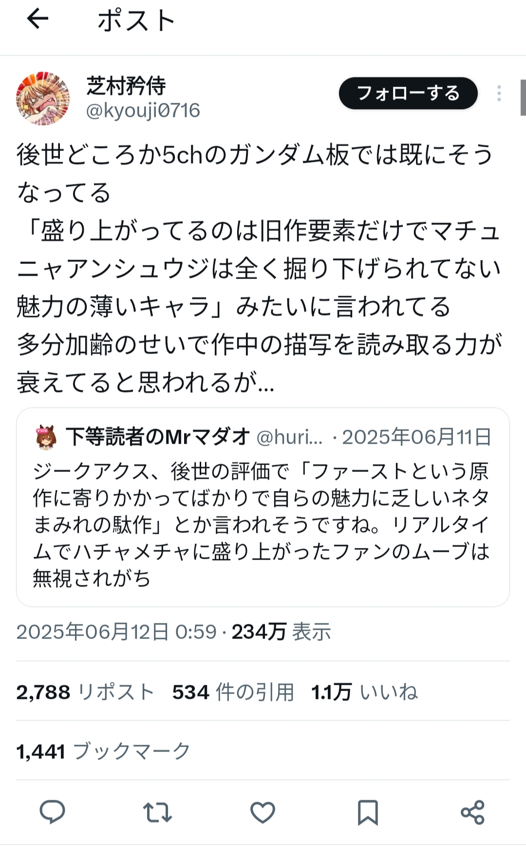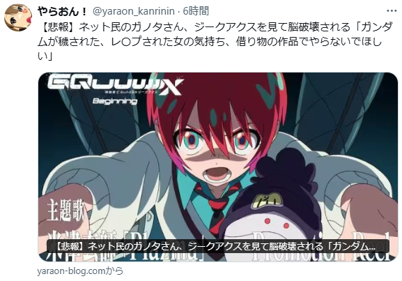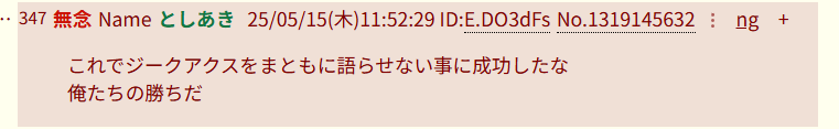 | … | 991無念Nameとしあき26/01/17(土)13:31:59No.1380738322そうだねx1>ほらなただジークアクスが叩かれるのは嫌!ってのを回りくどく言ってるだけだろ |