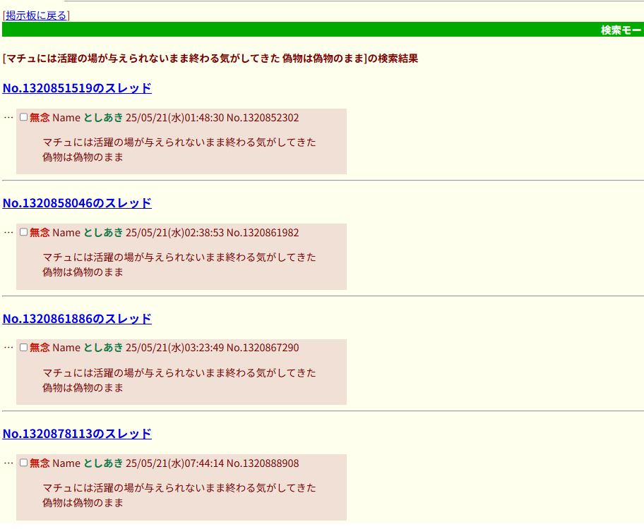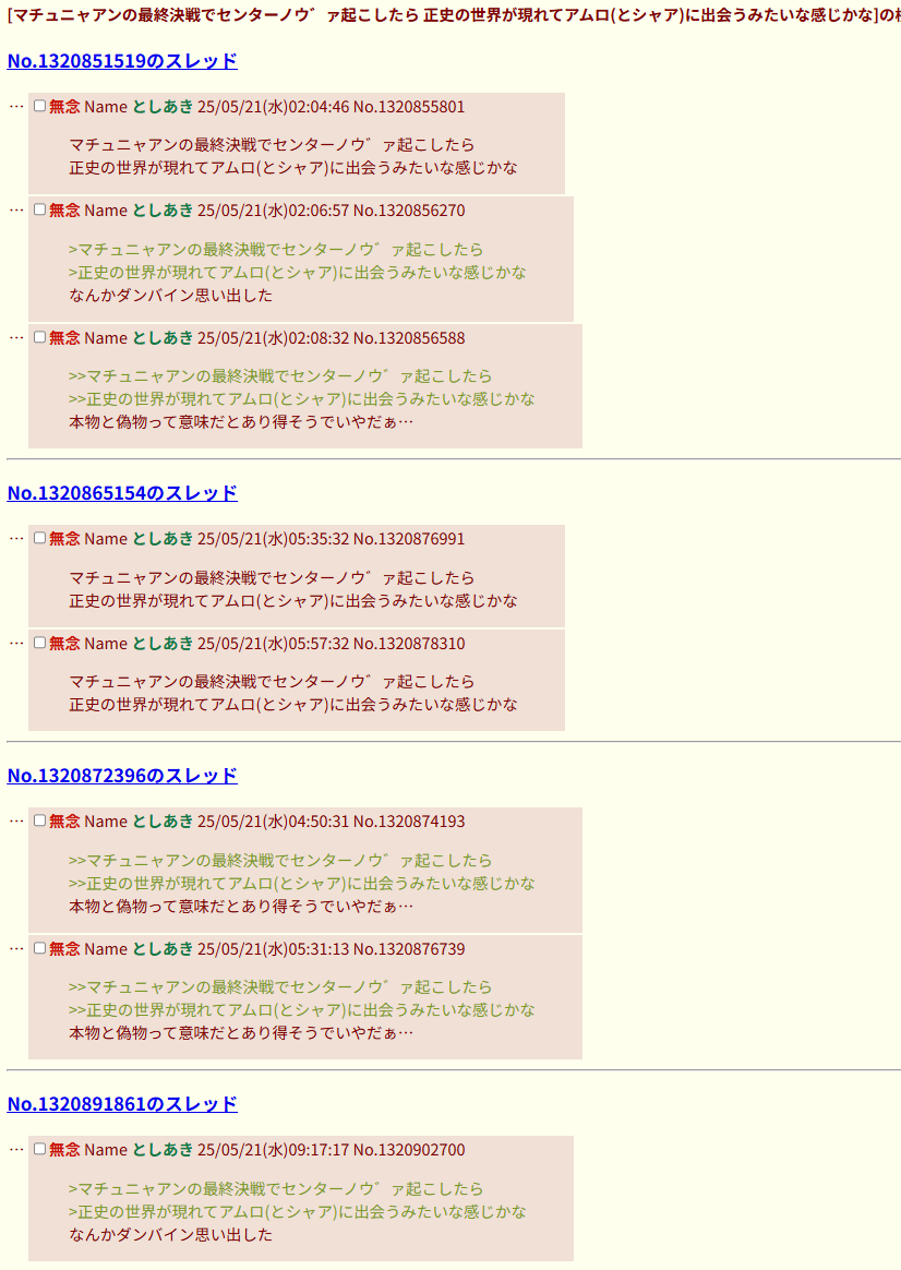 | … | 906無念Nameとしあき26/01/17(土)13:24:01No.1380736564+>考察勢がはしご外されたときが最大風速 |