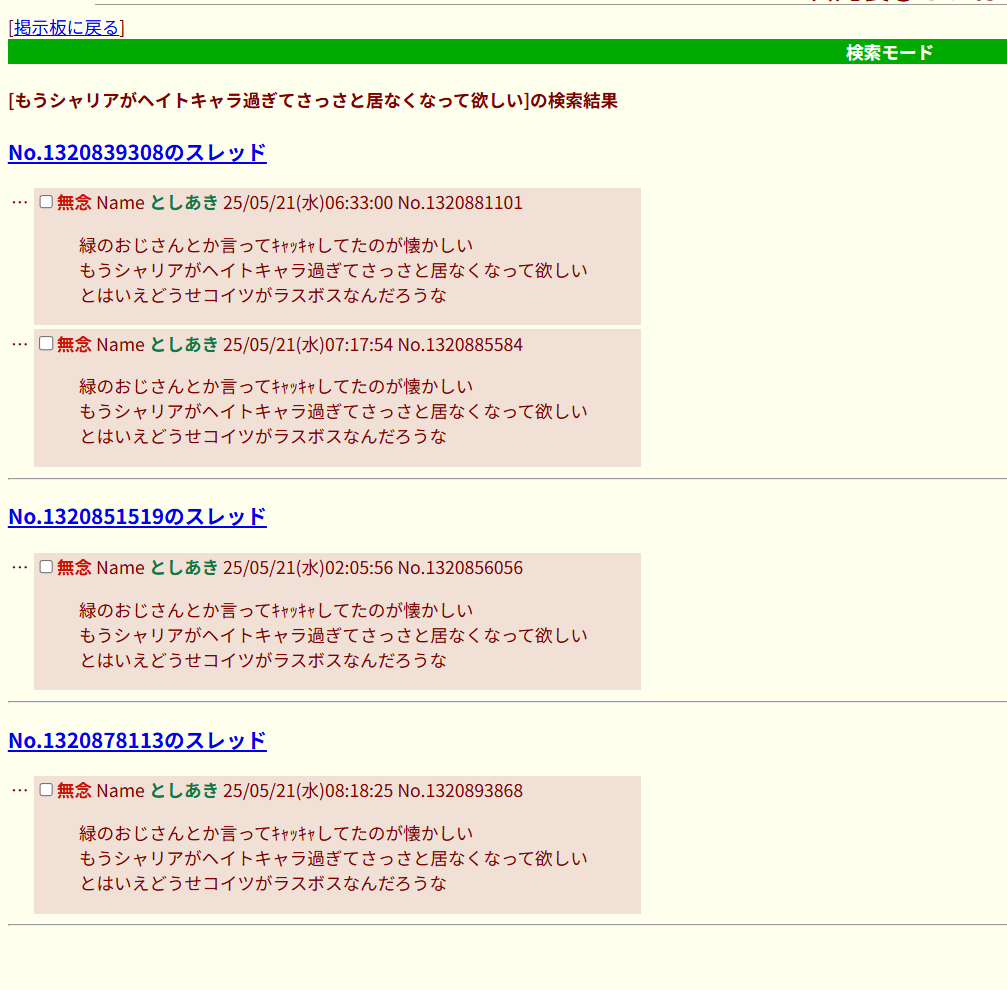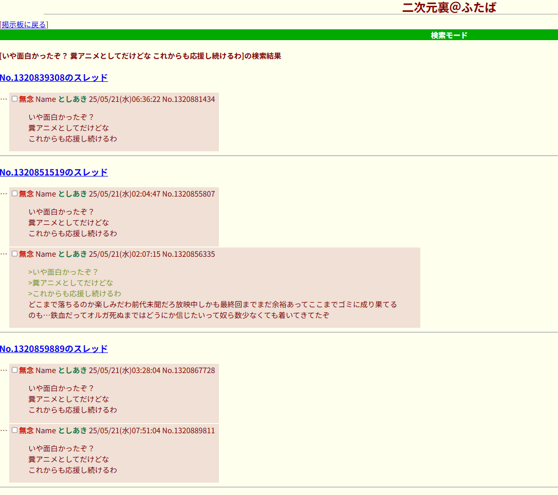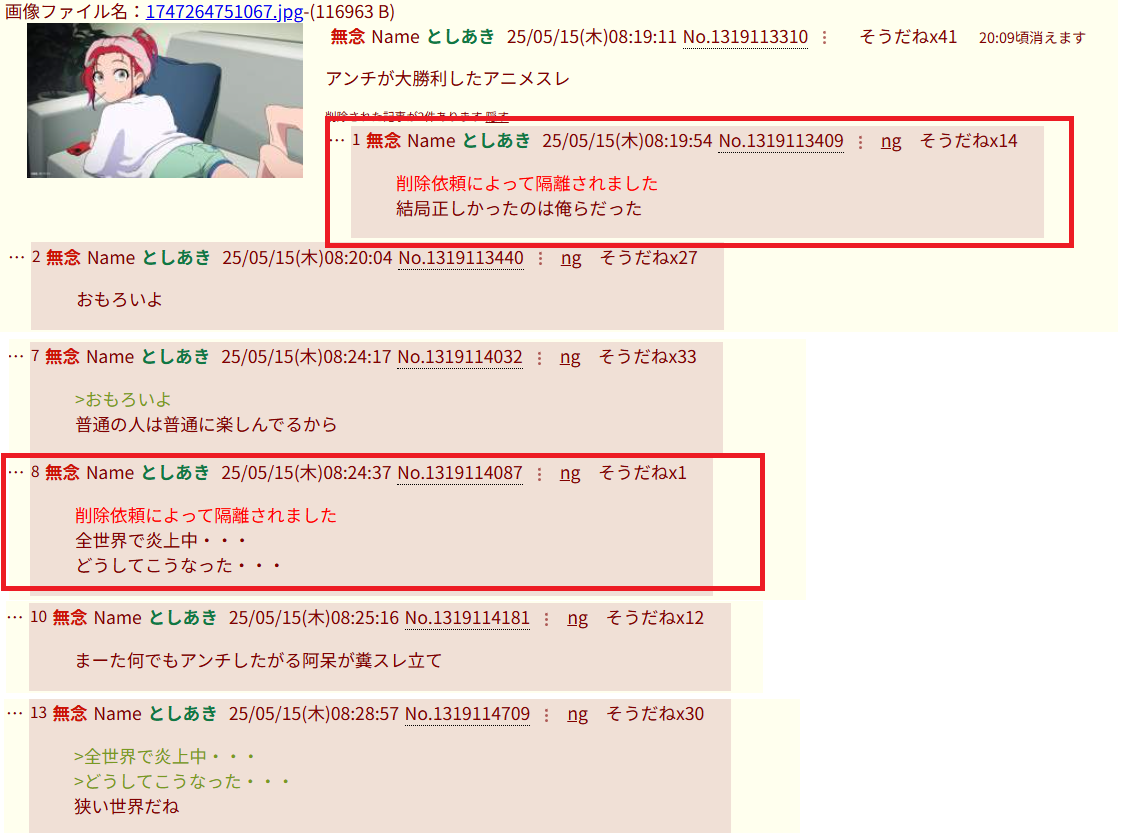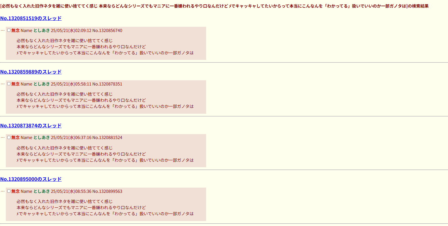| … | 981無念Nameとしあき26/01/17(土)13:31:08No.1380738130そうだねx2>>>そら終わった作品に粘着して叩き続けるのは普通にアホだろ… |