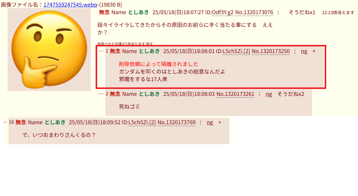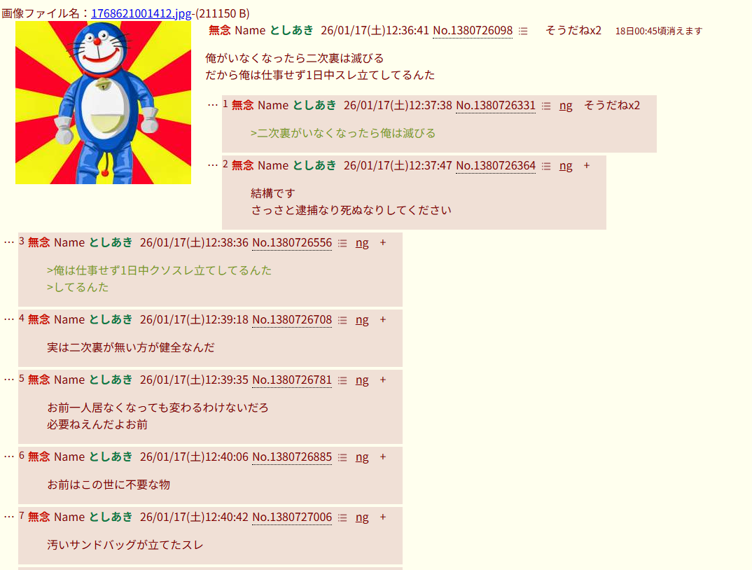 | … | 995無念Nameとしあき26/01/17(土)13:32:26No.1380738443+クソなのはお前の人生だろ(笑) |
