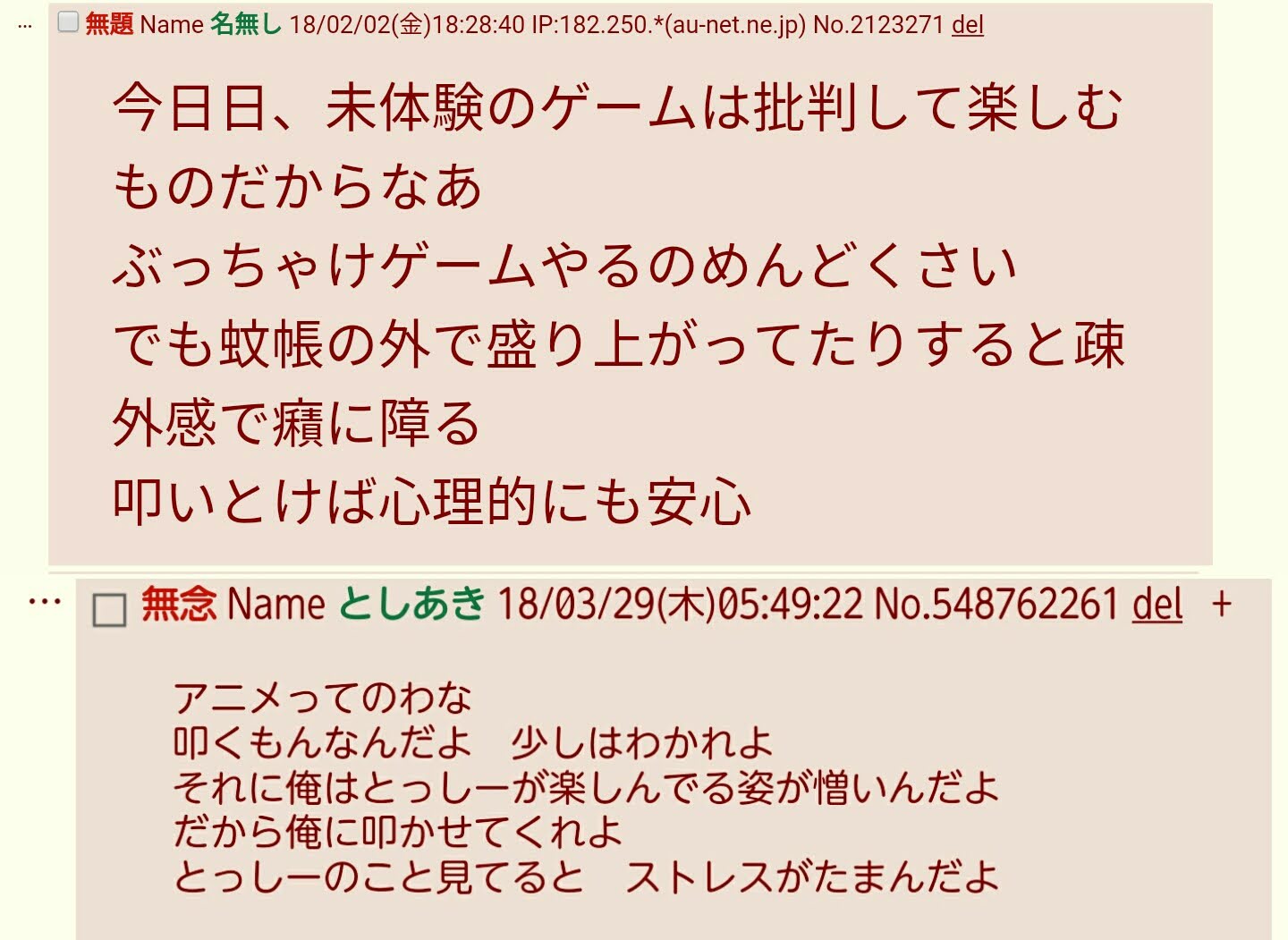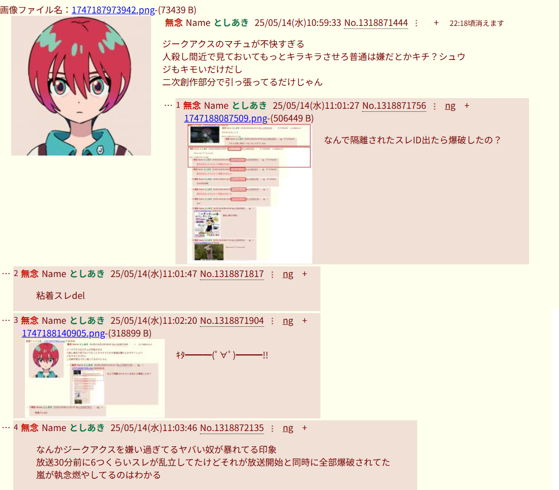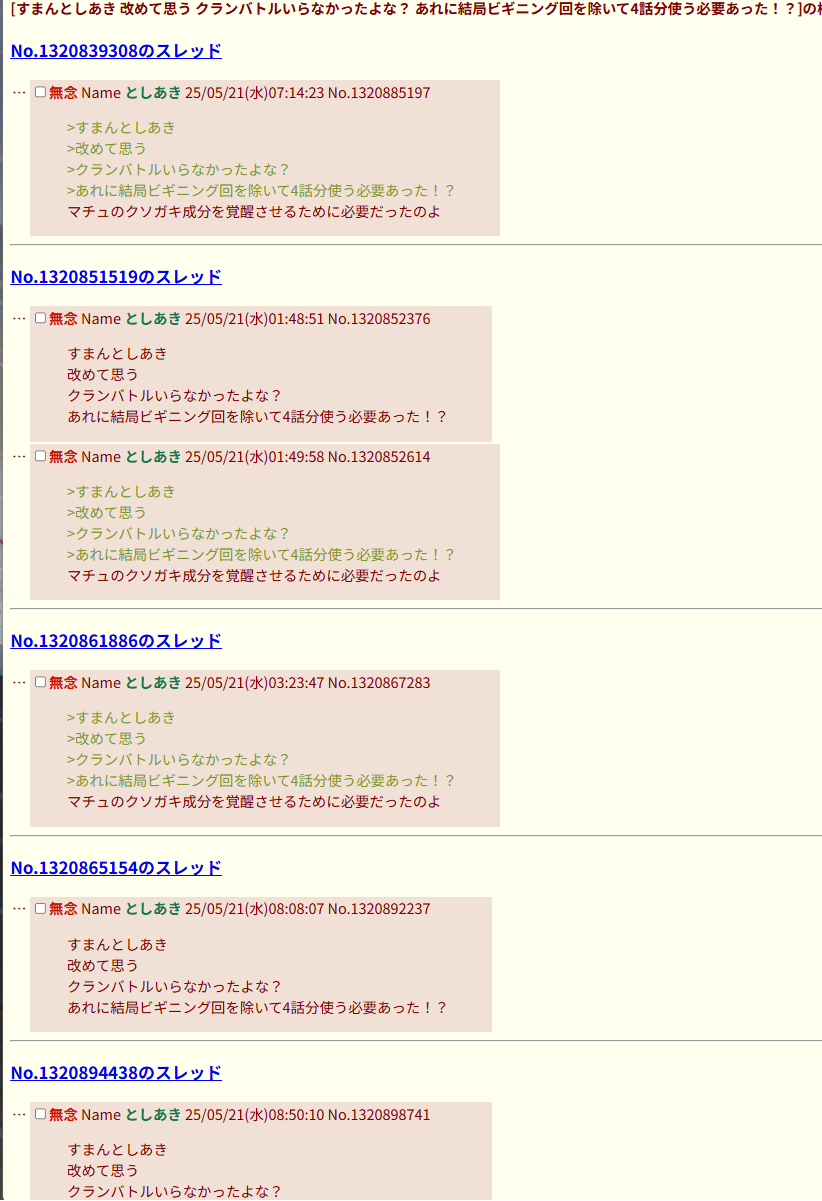| … | 992無念Nameとしあき26/01/17(土)13:32:08No.1380738367+>>>>そら終わった作品に粘着して叩き続けるのは普通にアホだろ… |