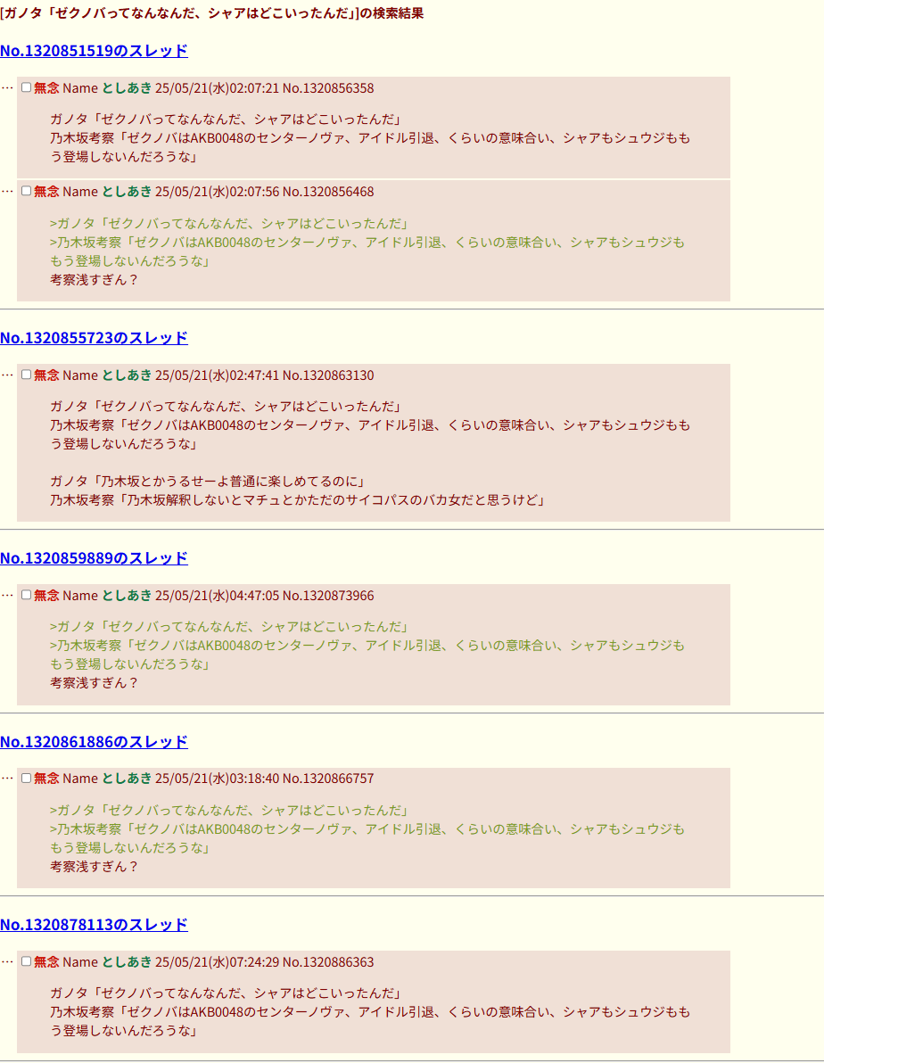 | … | 939無念Nameとしあき26/01/17(土)13:26:37No.1380737125+バカに達してくれればいいけど乃木坂とか出てくるから笑うに笑えなくないんだよな |