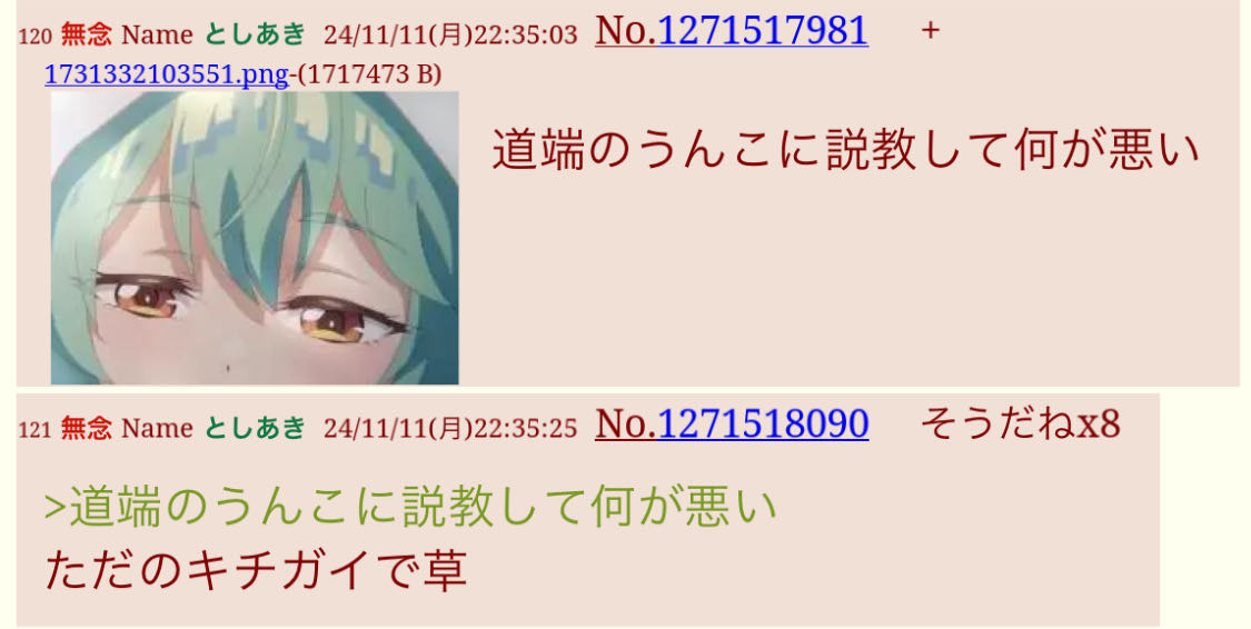 | … | 54無念Nameとしあき26/01/17(土)14:30:57No.1380751093+ 1768627857726.jpg-(175356 B) 京都の伏見区のめぶき鯖爺と会話しても知能が落ちるだけだからみんな青空文庫読むんだよ❤️ |