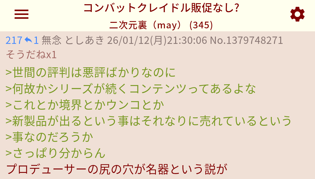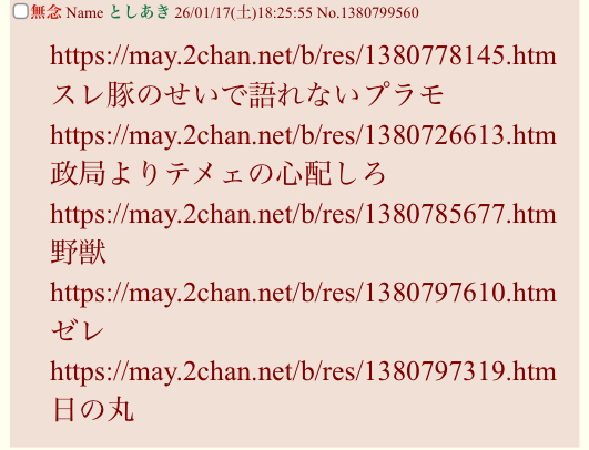 | … | 629無念Nameとしあき26/01/17(土)20:40:56No.1380837803そうだねx1>mayのゴミスレ三銃士好き |