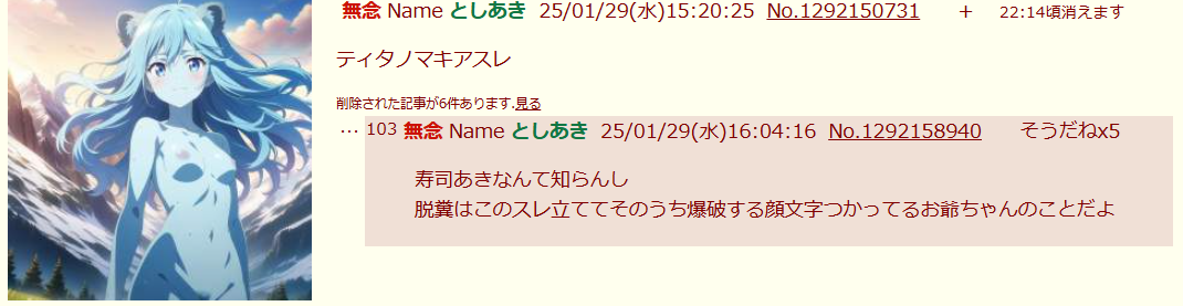 | … | 618無念Nameとしあき26/01/17(土)20:32:48No.1380835368そうだねx4そもそも管理人に規制されてるしとしあきにも何度もdelくらって隔離されてるお前らが二次裏に呼ばれてないんだわ |