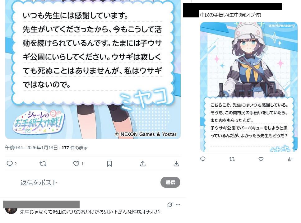 | … | 168無念Nameとしあき26/01/17(土)20:15:31No.1380830432+まぁRABBIT小隊の扱いの悪さはまず責任を果たさない先生とシナリオ破綻させたライターのせいになるからなぁ |