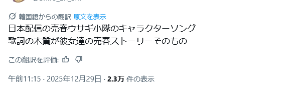 | … | 238無念Nameとしあき26/01/17(土)21:25:16No.1380851539そうだねx1>メイン貰ってもただでさえ微妙なポジを拭えなかったRABBITをヨンハの馬鹿がトドメ刺したからな |