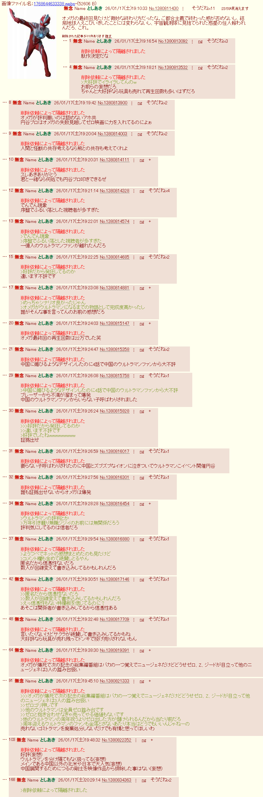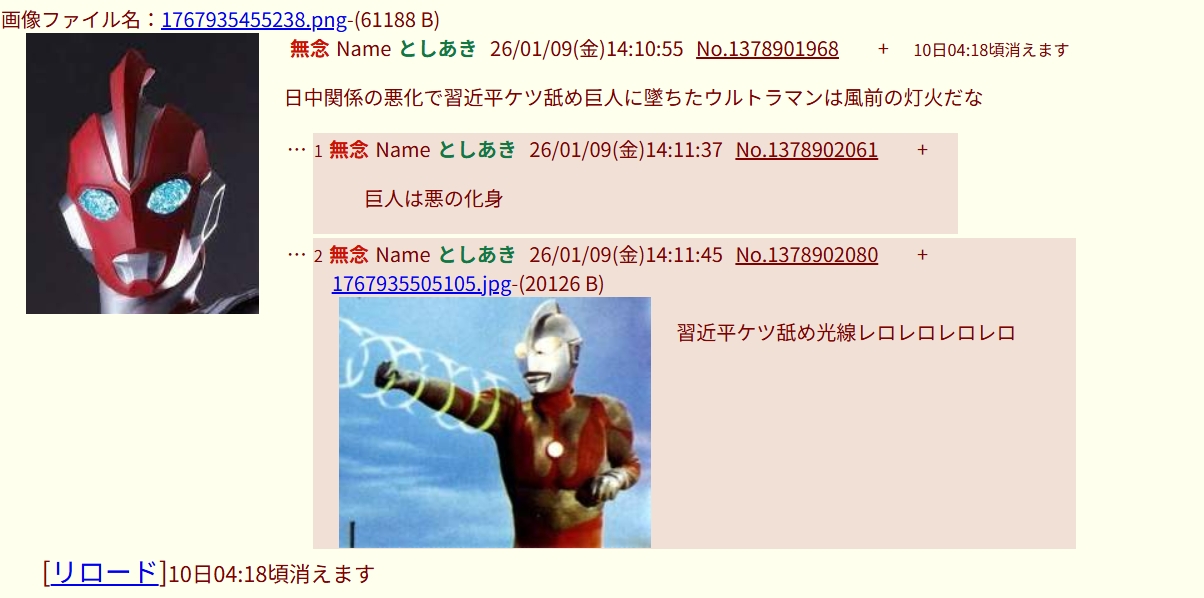 | … | 51無念Nameとしあき26/01/18(日)01:27:29No.1380914731+おっスレ豚がキングオージャースレでウルトラマン叩きを始めた事で有名な荒らしか |